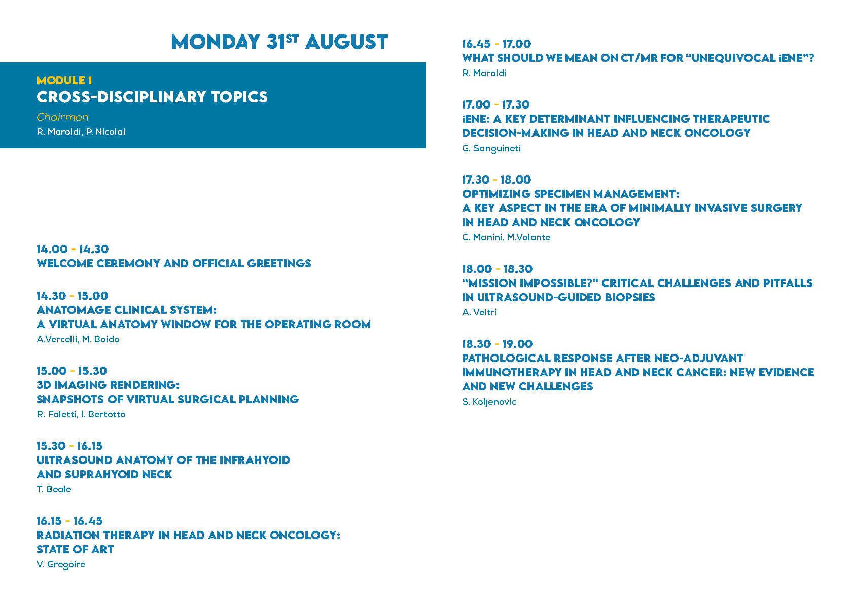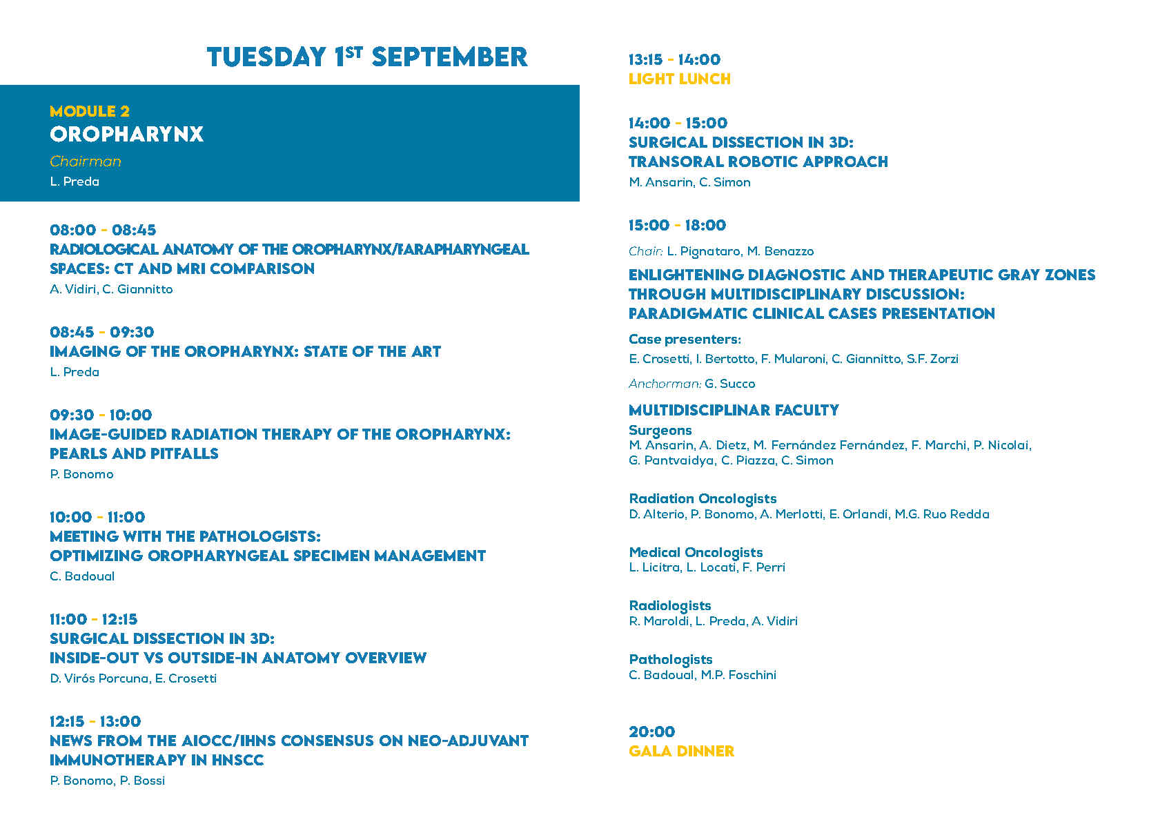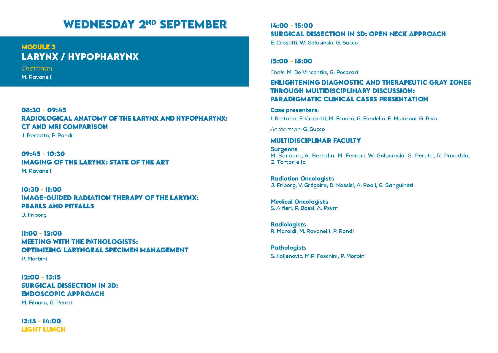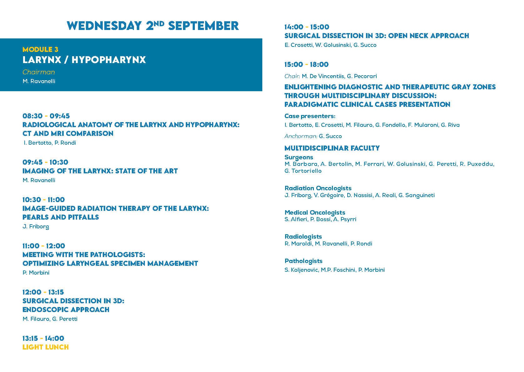 The course is structured into two full daily modulesdedicated to the larynx and the oropharynx, complemented bya half-day session focused on cross-disciplinary topicsthat are common to both anatomical sites and relevant across specialties.