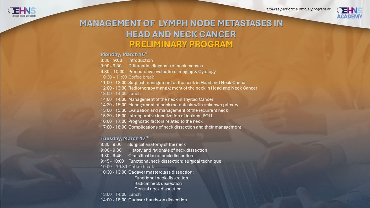 The Department of Otorhinolaryngology—Head and Neck Surgery at La Paz University Hospital in Madrid is pleased to present the course "Management of Lymph Node Metastases in Head and Neck Cancer", part of the EHNS Academy program.
